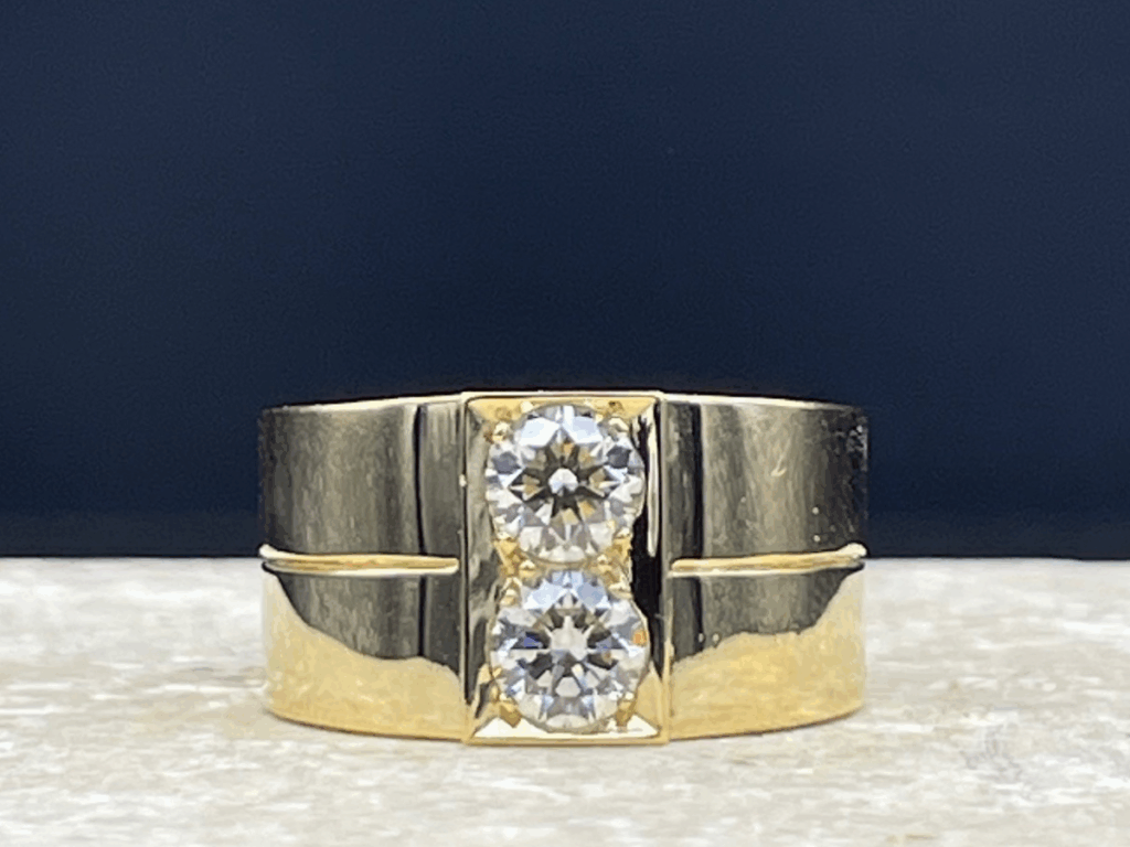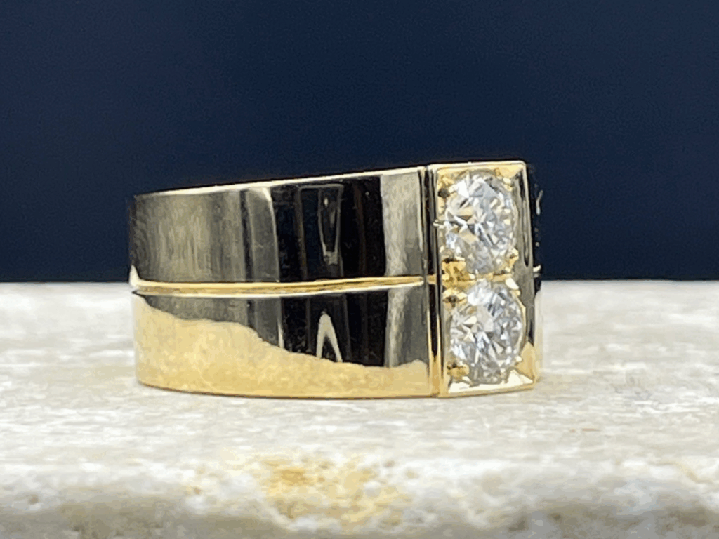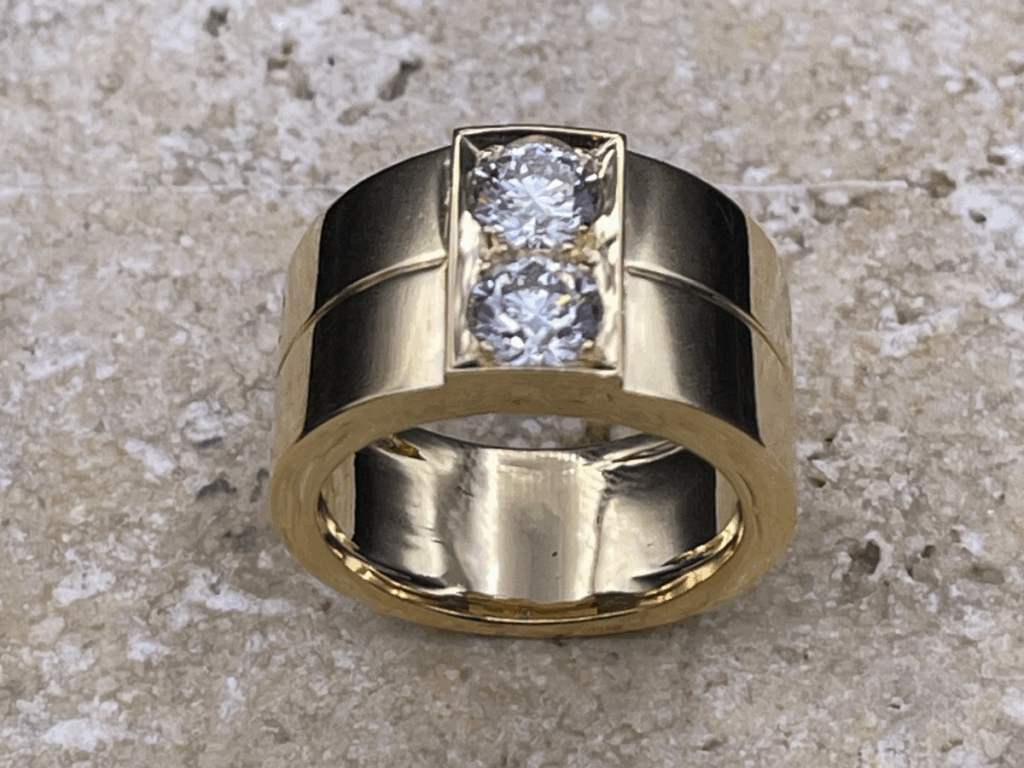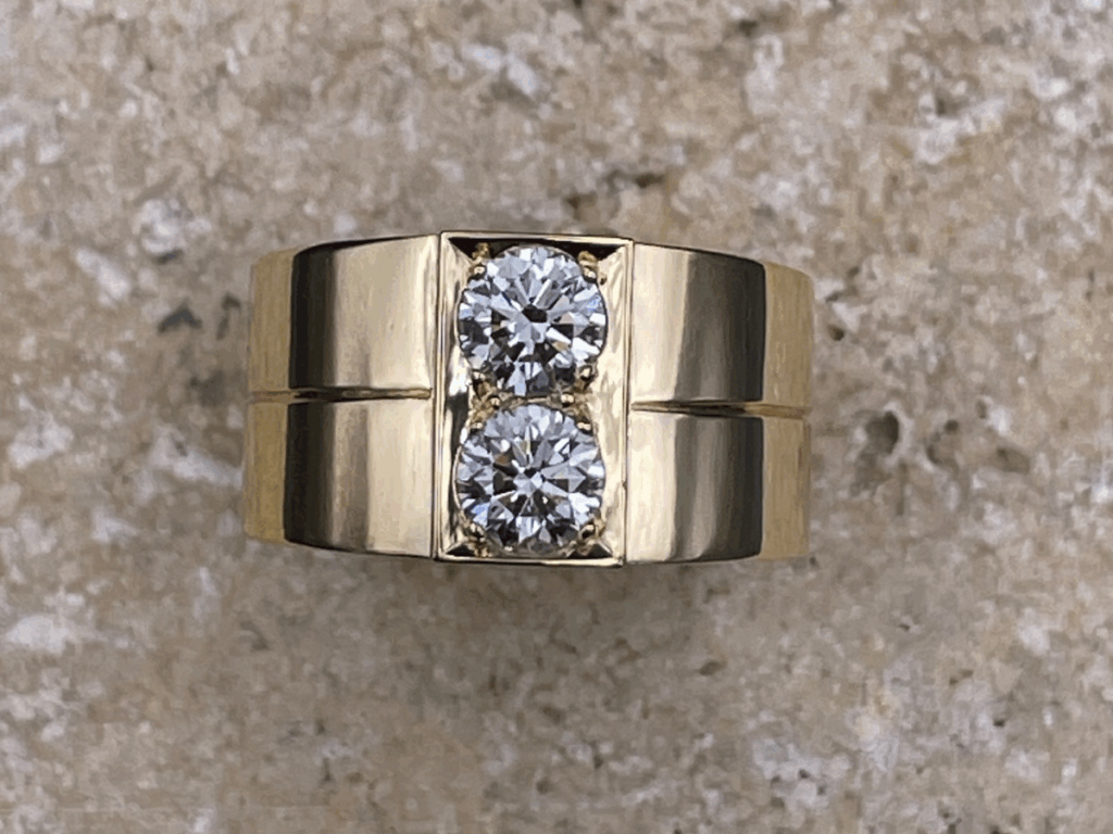 Bague création Van Hoye composée d’un jonc plat large en or jaune 18 carats avec 2 diamants en son centre de 0,50 carat chacun. Cette bague a été réalisée sur mesure dans notre atelier à Paris. Cette réalisation a été fabriquée pour un de nos clients pour une naissance.