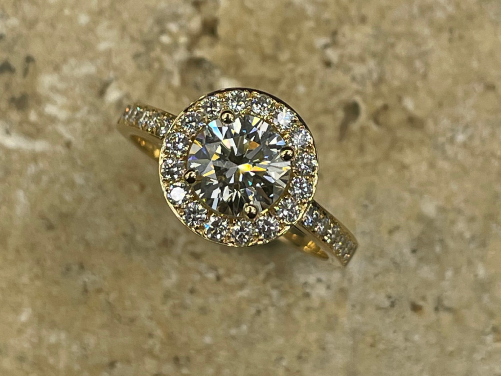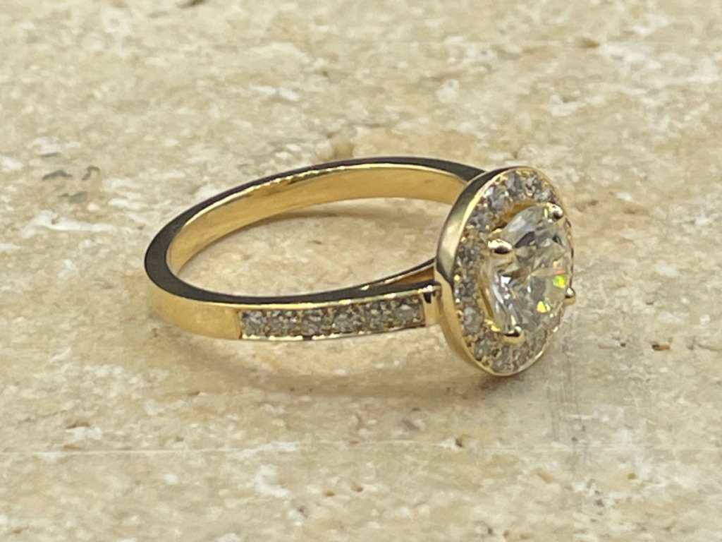 Montée en or jaune 18 carats, elle met en valeur un diamant central taille brillant, sublimé par un délicat entourage pavé de diamants formant un halo lumineux. L’anneau, finement serti de diamants, prolonge l’éclat de la pierre centrale pour une brillance exceptionnelle.
