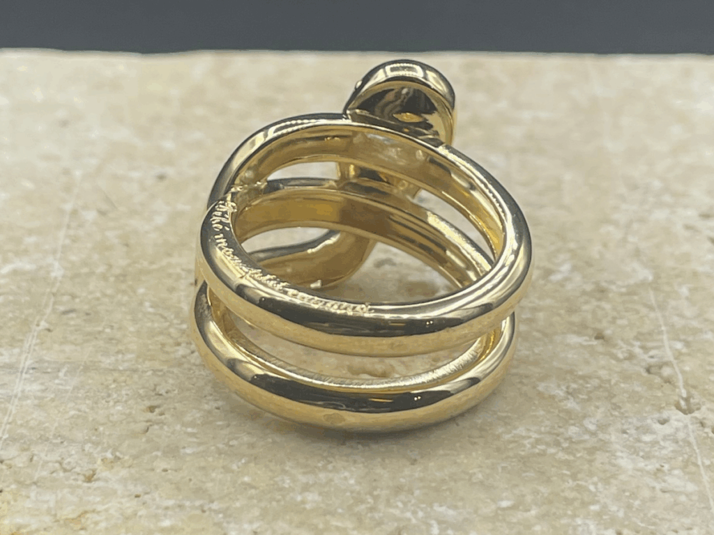 Pièce de caractère, cette bague en or jaune 18 carats révèle une architecture audacieuse aux lignes douces et organiques. Son motif galbé, presque rubané, enveloppe le doigt avec volume et confort tout en laissant la lumière circuler entre les courbes.