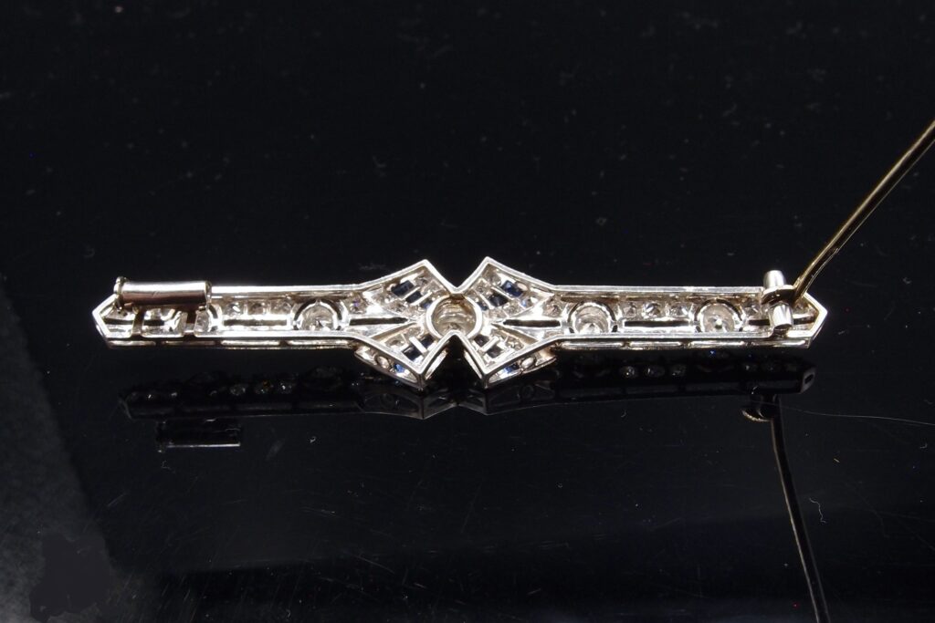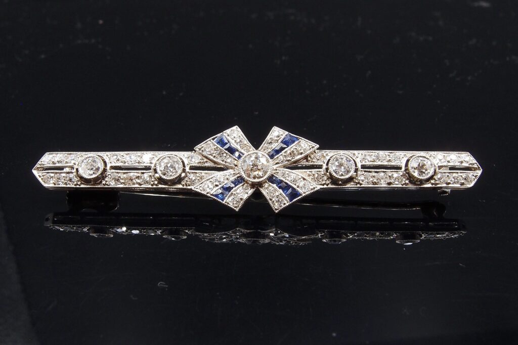 Elegante Broche en platine vers 1925 , modèle ” barrette” , sertie de diamants taille ancienne, ornée en son centre d’un motif “Noeud” réhaussé de 12 petits saphirs calibrés . 5 diamants principaux en serti clos sont accompagnés de 52 plus petits diamants . poids total estimé des diamants : 2.40 cts .Sertis perlés sur l’ensemble de la broche . Epingle en or gris 18 carats avec fermoir de sécurité . Travail fait main et poinçons français d’époque . Etat remarquable de conservation .