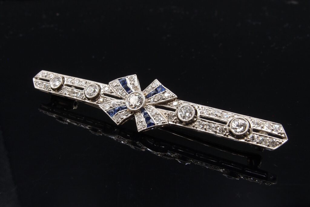 Broche en Platine Art Déco diamants et saphirs calibrés , vers 1925